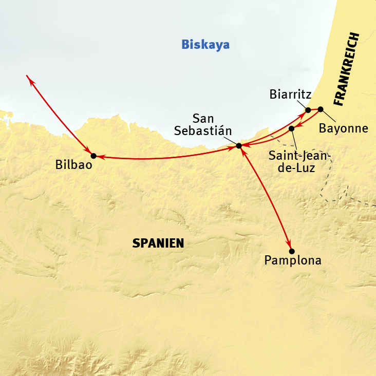 Euskadi, das Land der Basken, beeindruckt mit seiner uralten Sprache, der reichen Kultur und innovativen Entwicklungen in Spanien. In Bilbao haben moderne Designs die ehemaligen Werften ersetzt, darunter das berühmte Guggenheim Museum von Frank O. Gehry. San Sebastián, von den Basken "Donostia" genannt, war 2016 Kulturhauptstadt Europas und besticht durch seine kulturelle Szene, Belle Epoque-Gebäude und den malerischen Stadtstrand. Baskenland bietet eine hohe Dichte an Michelin-Sterne-Restaurants. Traditionelle Pintxos, die baskischen Tapas, überzeugen kulinarisch, begleitet von Rioja-Weinen oder spritzigem Txakoli. Die Küche basiert auf lokalen Zutaten wie Biskaya-Meeresfrüchten und landwirtschaftlichen Erzeugnissen. Unsere Kleingruppenreise führt durch moderne Städte, Dörfer und Weinregionen, ideal für Feinschmecker und Kulturinteressierte!Die Reise ist entspannt gestaltet, mit freier Zeit – in San Sebastián ein ganzer Tag – für eigene Erkundungen oder Entspannung.