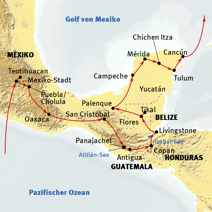 Die indianischen, prä-kolumbischen Hochkulturen findet man nicht nur in Mexiko. Oftmals wurden geografisch, kulturhistorisch und anthropologisch zusammengehörende Großräume durch willkürliche Grenzziehungen zerteilt. So blühten die großen meso-amerikanischen Hochkulturen keineswegs nur innerhalb der mexikanischen Grenzen. Insbesondere das Maya-Reich erstreckte sich von der Yucatán-Halbinsel bis nach Guatemala und Honduras. Tikal in Guatemala und Copán in Honduras mit seinen einzigartigen Altären und Stelen gehören mittlerweile fast zum Pflichtprogramm vieler Studienreisender in Mittelamerika. Andere präkolumbische Hochkulturen hatten vergleichbare geographische Dimensionen, so dass der hier vorgestellte Tourverlauf die natürlichen geographischen Gegebenheiten über heutige Landesgrenzen hinweg und in Jahrhunderten gewachsenen Kulturräumen widerspiegelt. Unsere umfassende Rundreise stellt den Zusammenhang der verschiedenen Ausgrabungsstätten im zentralen Mexiko und der Maya-Zentren der besuchten Länder her und gibt uns einen ungeschmälerten Einblick in das Zusammenspiel und die Funktionsweise der ehemaligen Hochkulturen Mittelamerikas.