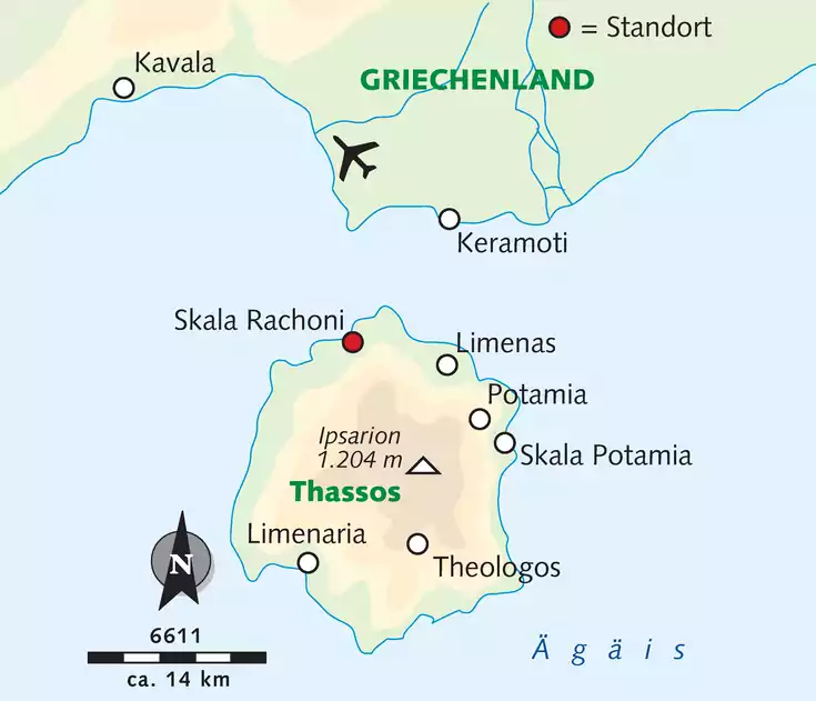 Flug nach Kavala. Von dort Transfer zur Fähre und Überfahrt nach Thassos. Transfer zum Hotel und Zimmerbezug.