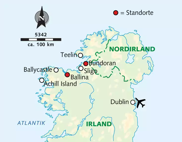 Während unserer Reise übernachten wir 5 Nächte (Termine: 28.06., 26.07. und 02.08.) im Vier-Sterne-Hotel Great National Ballina. Das Hotel liegt im charmanten Ballina, etwa 4 km vom Zentrum entfernt. Zur Hotelausstattung zählen ein Restaurant, Innenpool, Sauna, Dampfbad, Jacuzzi und Fitnessraum. Das Éidin Spa verwöhnt mit einer Vielzahl an Massagen und individuellen Anwendungen (gegen Aufpreis). Die Zimmer sind ausgestattet mit TV, Telefon, Wasserkocher und Haartrockner. Während unseres Aufenthalts vom 05.07. - 14.07.2026 verbringen wir 5 Nächte im Drei-Sterne-Hotel Broadhaven Bay in Belmullet, das nur etwa fünf Gehminuten vom Zentrum entfernt und direkt an der Atlantikküste liegt. Zur Ausstattung zählen ein Restaurant, eine Bar sowie ein Spa- & Freizeitbereich mit Fitnessraum. Die Zimmer bieten unter anderem Satellitenfernsehen, WLAN, Tee-/Kaffee-Zubereitungsmöglichkeiten, Haartrockner sowie Minibar.