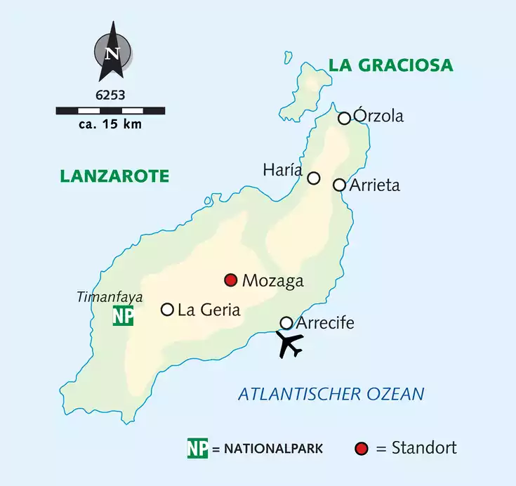 Hotel: Das kleine, charmante Drei-Sterne-Hotel El Grifo, zugleich als denkmalgeschütztes Kulturerbe anerkannt, verbindet traditionelles kanarisches Flair mit modernem Komfort. Die gemütlichen Gemeinschaftsbereiche laden zum Verweilen und Entspannen ein. Zimmer: Die neun liebevoll eingerichteten Zimmer sind mit Klimaanlage, TV, WLAN, Safe und Föhn ausgestattet. Verpflegung: Frühstück im Hotel. Die inkludierten Mittag- und Abendessen nehmen wir in auswärtigen Restaurants ein. Lage: Das Hotel El Grifo liegt idyllisch in der Weinregion La Geria, umgeben von Vulkanlandschaft und Weinbergen. Die ruhige Lage macht das Hotel zum idealen Entspannungssort nach aktiven Tagen.