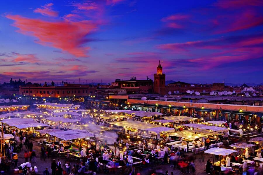Rundgang am Vormittag: Es ruft der Muezzin vom Minarett der altehrwürdigen Koutoubia-Moschee, durch das Stadttor Bab Agnaou strömen Händler mit ihren Waren. Wohin? Zum Djemaa el-Fna, dem einstigen Platz der Gehenkten. Heute tobt das Leben auf dem Platz: Akrobaten zeigen Kunststücke, Gesundbeter und Zahnbrecher buhlen um Kundschaft. Wir nehmen Platz in einem Café und lassen bei Minztee und Gebäck die farbenfrohen Eindrücke auf uns wirken. Freie Zeit am Nachmittag. F/A