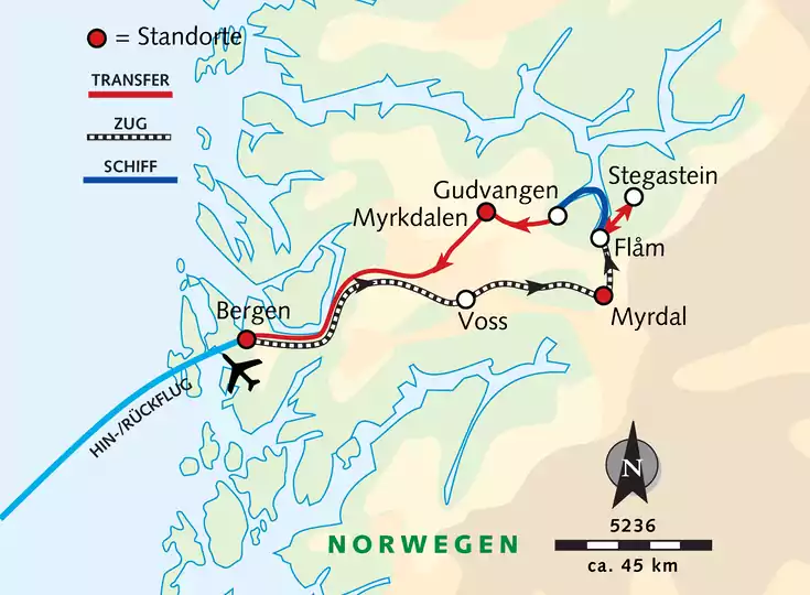 - Transfers in Norwegen gemäß Programm (mit Linienbussen, Charterbussen und per Zug)