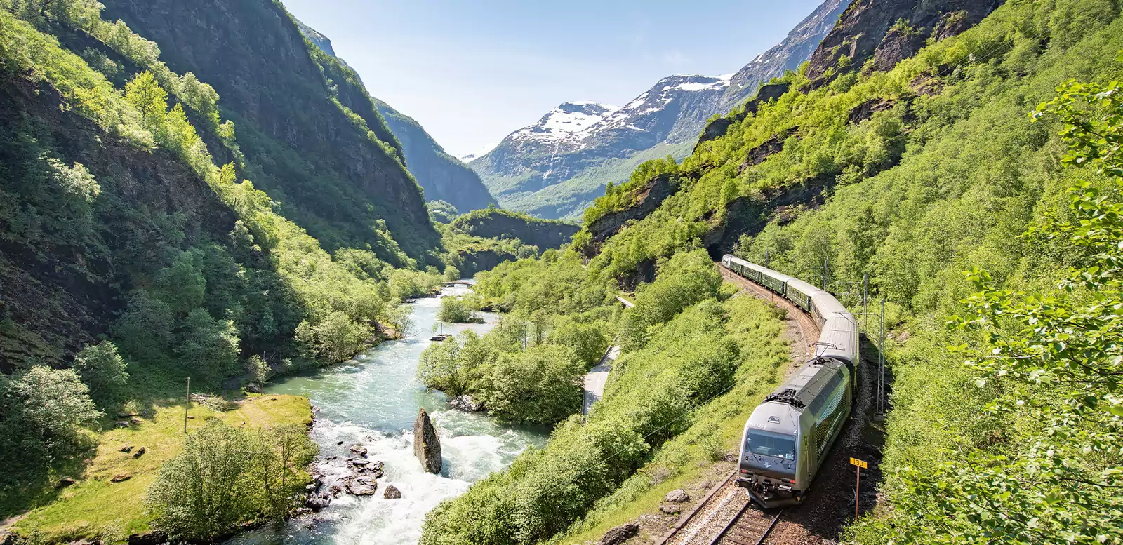 Direkt vom Hotel fahren wir mit der berühmten Flåmbahn hinab zum gleichnamigen Ort. Ein Shuttlebus bringt uns zum beeindruckenden Aussichtspunkt Stegastein. Mit einem nachhaltigen, elektrisch betriebenen Fjordschiff geht es dann zu einer zweistündigen Fahrt auf dem UNESCO-geschützten Nærøyfjord. Von Gudvangen bringt uns ein kurzer Transfer ins komfortable Myrkdalenhotel.