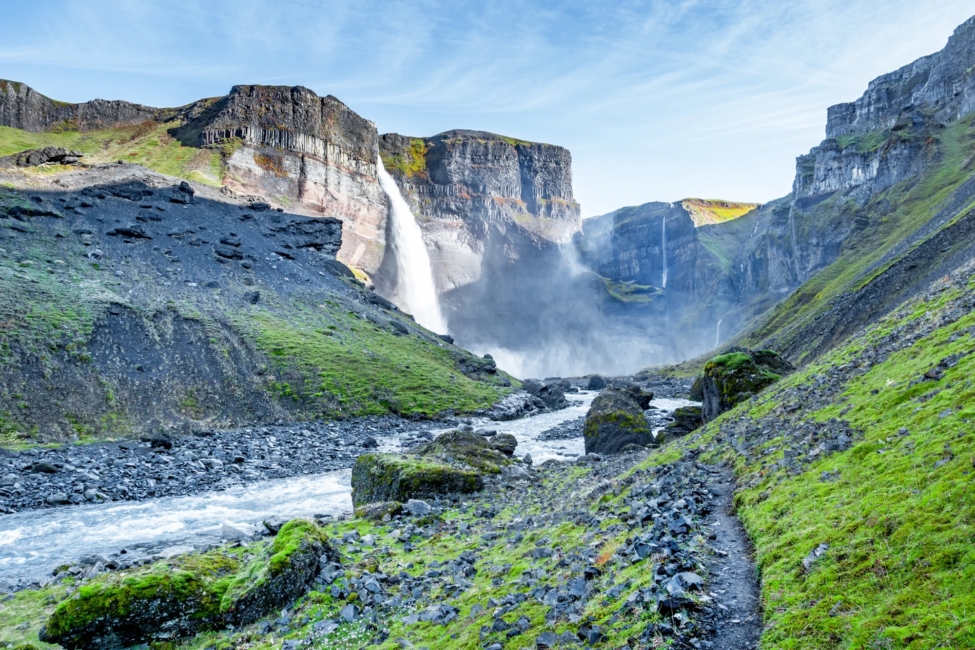 Fahren Sie am Gletscherfluss Thjorsa entlang zum Wikingerhof Stöng. Der freigelegte Hof wurde 1104 bei einem Vulkanausbruch verschüttet. Wanderung zur Schlucht Gjain oder zum Wasserfall Haifoss.