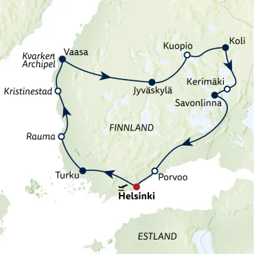 Von der historischen Hafenstadt Turku führt die Route entlang der bottnischen Küste über Vaasa bis hin zum Koli Nationalpark im Herzen des Seengebiets. Unterwegs entdecken Sie malerische Altstädte, unberührte Natur und weite Ausblicke – und natürlich auch die finnische Hauptstadt Helsinki mit ihrem maritimen Flair und kulturellen Höhepunkten. Begleitet wird Ihre Reise von kulinarischen Spezialitäten, herzlichen Begegnungen und authentischen Einblicken in die finnische Lebensart.