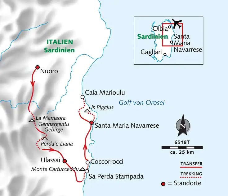 Hoch hinaus, tief durchatmen, staunen: Vom Dach Sardiniens direkt ans Meer – wilder geht’s nicht! Du steigst auf den höchsten Gipfel des Gennargentu, wanderst vorbei an der mächtigen Felskathedrale Perda ’e Liana, folgst luftigen Graten, einsame Hochebenen liegen dir zu Füßen, am Horizont schimmert schon das Meer. Und das Finale? Ein Traumstrand wie gemalt – Cala Mariolu mit strahlend weißen Kieseln und türkisblauem Wasser. Wild, ursprünglich, paradiesisch – das ist Sardinien. Rucksack schultern und los geht´s!