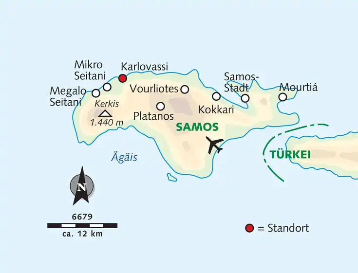 Eine Woche Auszeit auf der schönen Insel Samos! Der Westen der Insel ist herrlich grün und geprägt vom höchsten Berg, dem 1.434 m hohen Kerkis. Von unserem Standort Karlovassi aus unternehmen wir Wanderungen zu den Potami-Wasserfällen und den traumhaften „Teufelsstränden“ Megalo Seitani und Mikro Seitani. Herrliche Ausblicke auf die Küste, der Duft der Macchia und farbenfrohe Bergdörfer sind unsere Begleiter.