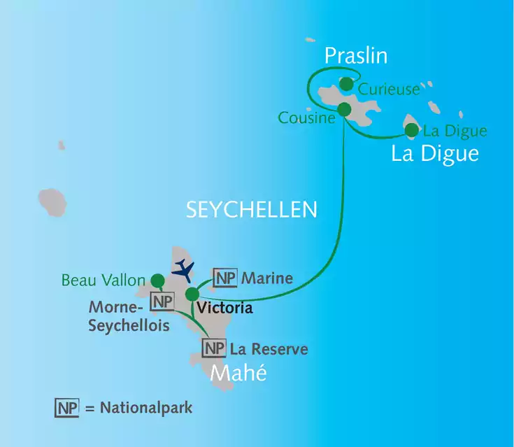 Den Garten Eden auf andere Art entdecken: sechs Inseln zu Fuß, mit dem Rad und per Boot. Exotische Coco-de-Mer- Palmen begegnen uns auf unseren Wanderungen in Naturreservaten. Kristallklares Wasser und malerische Buchten werden von den wie geschliffen aussehenden Granitfelsen eingerahmt. Einsame, weiße Strände, die wir mit dem Fahrrad erreichen, laden zur Entspannung ein. Auf traumhaften Geheimtipp-Wanderungen durchstreifen wir üppigen Urwald, gelangen zu tollen Aussichtspunkten und genießen das Leben auf Mahé, La Digue und Praslin. Worauf wartest du noch? Tauch ein ins Inselparadies!