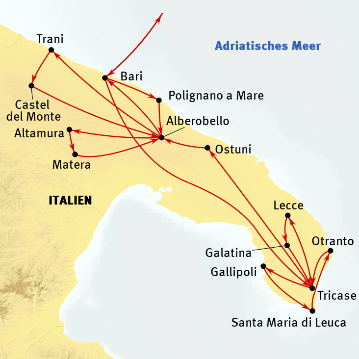 Apulien, das verträumte Land der Trulli und Kastelle, ist eine wahre Idylle am Absatz des Stiefels im Südosten Italiens. Beim Durchqueren dieser zauberhaften Region beeindruckt die Vielfalt an Natur, Geschichte und Tradition: das kristallklare Adriatische Meer, unberührte Küsten, rote Erde der Hügellandschaft, alte Olivenhaine, mittelalterliche Dörfer in Weinbergen und kulturelle Städte. Besonders Alberobello mit seinen Rundhäusern und Lecce, das „Florenz des Südens“, sind bemerkenswert. Bari und Gallipoli bieten ein reiches kulturelles Erbe. Das Castel del Monte und die weißen Gassen Ostunis sind ebenso faszinierend. Im Stiefelabsatz verzaubern Orte wie Otranto und Santa Maria di Leuca mit Fresken und Grotten. Die apulische Küche verwöhnt mit Orecchiette und Locorotondo-Wein. Benvenuti in Apulien!