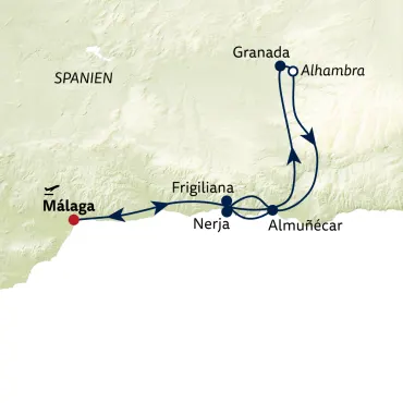 Entdecken Sie die landschaftliche Vielfalt der Region. In Frigiliana erwarten Sie weiß getünchte Häuser und blumengeschmückte Gassen. In Nerja bietet der berühmte „Balcón de Europa“ eine spektakuläre Aussicht über das azurblaue Meer. Genießen Sie im Anschluss ein typisch andalusisches Mittagessen, bestehend aus Grillgerichten und exotischen Früchten, in einer idyllisch gelegenen Finca bei Almuñécar.