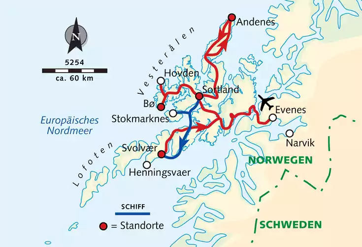 Auf Vesterålen erwandern wir den idyllischen Westen Langøyas und besuchen alte Fischerdörfer im wilden Nordwesten. Auf der Nordspitze Andøyas steigen wir neben schneeweisen Sandständen und Jahrtausende alten Moränenwällen auf zauberhafte Bergrücken. Die traditionsreiche Kultur der Samen auf Hinnøya bilden ein kontrastreiches Kulturprogramm. Höhepunkte der Reise bilden die Ausfahrt an den Rand des Kontinents zur Walsafari und die spektakuläre Fahrt mit der Hurtigrute durch den Raftsund auf die Lofoten. Die Hafenstadt Svolvaer ist ideal als Ausgangsort für Erkundungen der Insel Vestvagøy mit dem Besuch des Wikingermuseums und des pittoresken Henningsvær oder der Insel Skrova im Vestfjord.