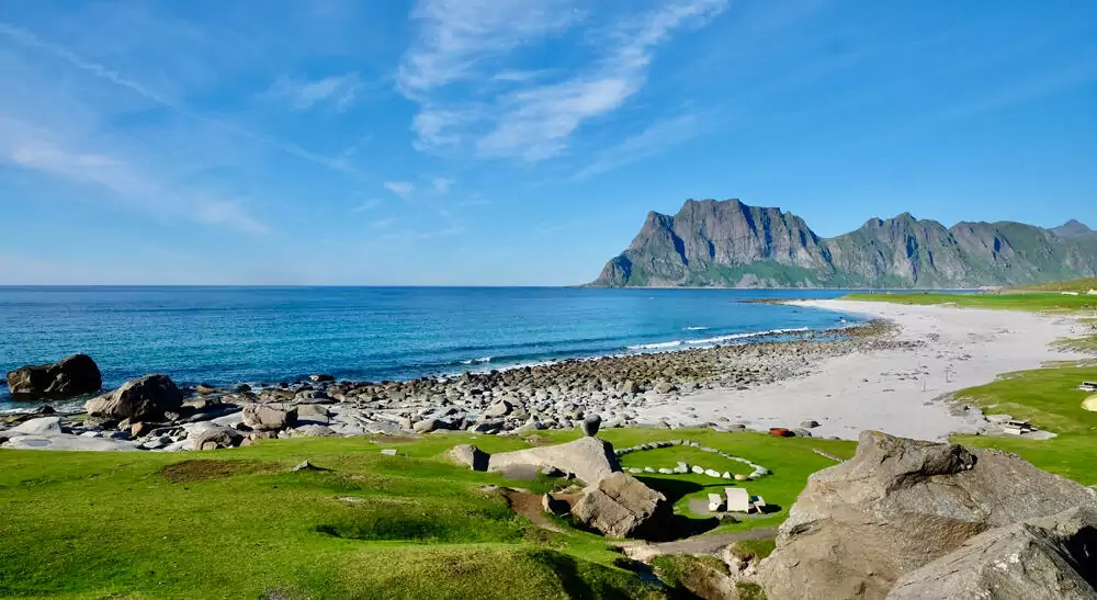 Der Bus bringt uns auf die größte Insel der Lofoten, wo wir das Wikingermuseums in Borg besuchen. Das nach archäologischen Befunden wiederaufgebaute Langhaus versetzt uns in die Zeit der Wikinger zurück. Mit 83 m Länge ist es die größte bisher gefundene mittelalterliche Hofstelle Skandinaviens. Auf historischen Pfaden wandern wir am Nachmittag von Haukland nach Utakleiv (GZ: 2 1/2 Std., +/- 170 m). Je nach Wetterlage lädt im Anschluss einer der schönsten Strände des Archipels zum Baden ein.