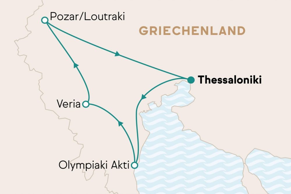 6 Übernachtungen/Frühstück: 1x Capsis Hotel, Thessaloniki; 2x Ouzas Luxury Hotel, Olympiaki Akti; 1x Aiges Melathron, Veria; 2x Rodon Guesthouse, Loutraki
