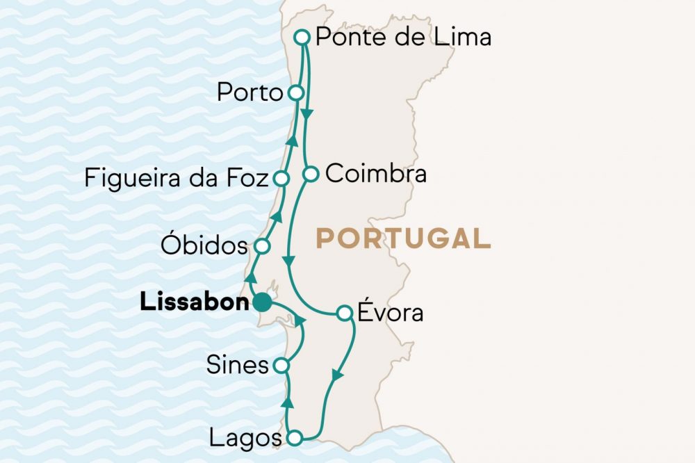 14 Übernachtungen/Frühstück: 1x HF Fénix Lisboa, Lissabon; 1x The Literary Man Óbidos Hotel, Óbidos; 1x Vila Galé Collection Figueira da Foz, Figueira da Foz; 2x Porto Trinidade Hotel, Porto; 2x Carmo's Boutique Hotel, bei Ponte de Lima; 1x Vila Galé Coimbra, Coimbra; 2x Vila Gale Évora, Évora; 2x Costa D’Oiro Ambiance Village, Lagos; 1x Sines Sea View Business & Leisure Hotel, Sines; 1x HF Fénix Lisboa, Lissabon