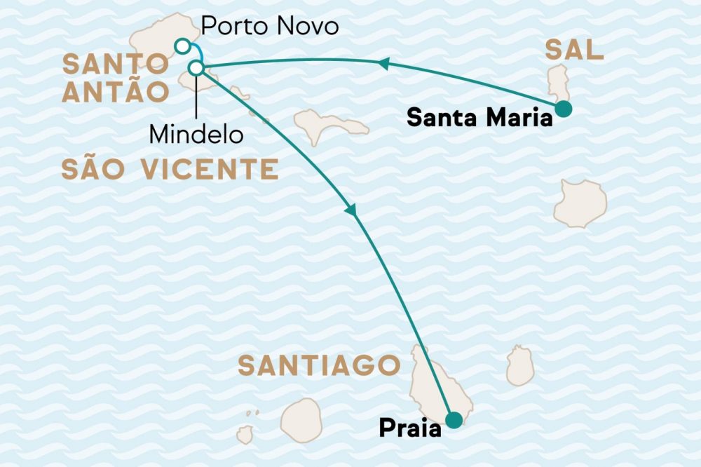 12 Übernachtungen/Frühstück: 4x Porto Antigo Hotel Residence, Santa Maria; 2x Hotel Blue Marlin, Mindelo; 2x Pension Musica do Mar, Santo Antão; 2x Residencial Aldeia Manga, Paul-Tal; 2x Oásis Tarrafal Alfândegas Suite, Santiago + Tageszimmer
