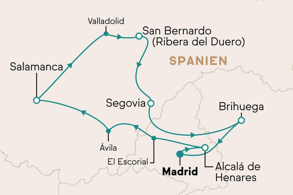 7 Übernachtungen/Frühstück: 1x Parador de Alcalá de Henares, Alcalá de Henares; 1x Hospes Palacio de San Esteban, Salamanca; 2x Hotel Castilla Termal Monasterio de Valbuena, San Bernardo; 1x Parador de La Granja, La Granja de San Ildefonso; 2x Hotel Castilla Termal Brihuega, Brihuega