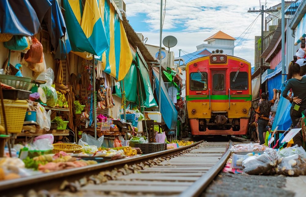 - Authentische Eindrücke vom lebhaften Treiben des Mae-Klong-Zugmarkts