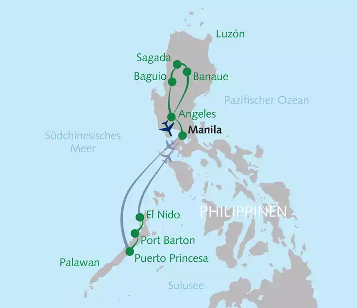 Du suchst ein Reiseziel voller tropischer, exotischer Highlights? Wie wäre es mit Berg- und Vulkanwelten, Regenwald mit reicher Flora und Fauna sowie üppigen Reisterrassen? Dazu kommen noch feine Sandstrände und eine traumhafte Unterwasserwelt. Die Philippinen bestehen aus über 7.000 Inseln, umgeben von türkisblauem Wasser – ein wahres Paradies. Sei dabei und entdecke die Inseln Luzon und Palawan. Lass dich von der einheimischen Gastfreundlichkeit verzaubern und schaff dir unvergessliche Erinnerungen!