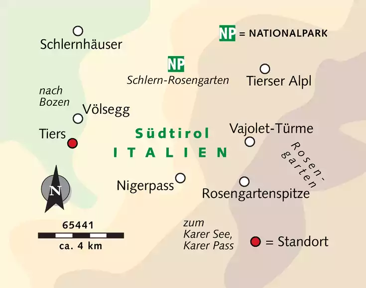 Hotel: Das Vier-Sterne-Alpinhotel Vajolet ist seit seiner Gründung ein Familienunternehmen. Es liegt am Fuße des Rosengartens im Tierser Ortskern mit wunderschöner Aussicht auf die Bergwelt. Das Haus ist im modernen Alpine Lifestyle-Flair gebaut und verfügt über 29 Zimmer und WLAN-Zugang im gesamten Haus (kostenlos). Das Hotel bietet uns naturnahe alpine Küche, ein Genusserlebnis in dem Tradition und Innovation zusammenfließen. Nach den Wanderungen können wir uns in der gemütlichen Sauna- und Wellnesslandschaft entspannen. Zimmer: Die Unterbringung erfolgt in der Zimmerkategorie Tschafon. Die Zimmer sind einfach, mit Holzmöbeln, Föhn, Sat-TV und Balkon eingerichtet. Auf Anfrage und nach Verfügbarkeit stehen die größeren im "alpinen Lifestyle-Flair" renovierten Kategorien Winkler und Enrosadira zur Verfügung. Verpflegung: Halbpension Lage: Der kleine Ort Tiers (1.037 Einwohner) liegt in Südtirol und gilt als traditionsreiches Wanderer- und Bergsteiger-Dorf: Er bildet einen Ausgangspunkt für unzählige Wanderungen und Bergtouren im Rosengarten-Gebiet und Schlern. Unser Hotel liegt zentral nur wenige Gehminuten von der Dorfmitte entfernt.