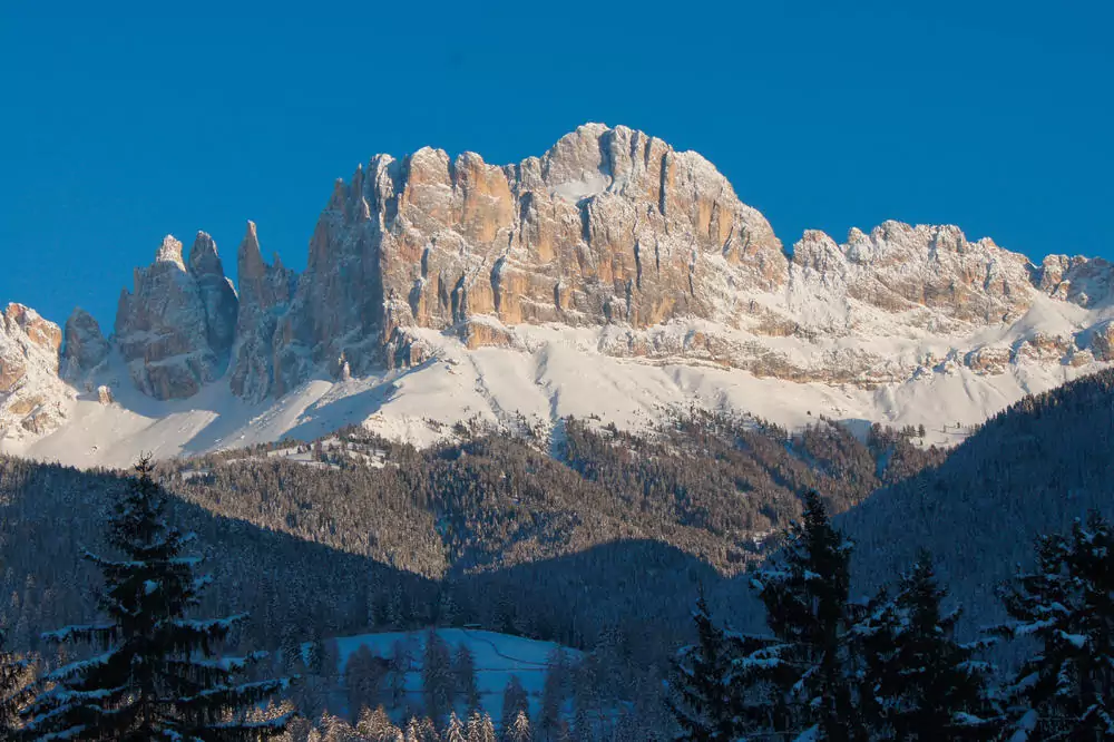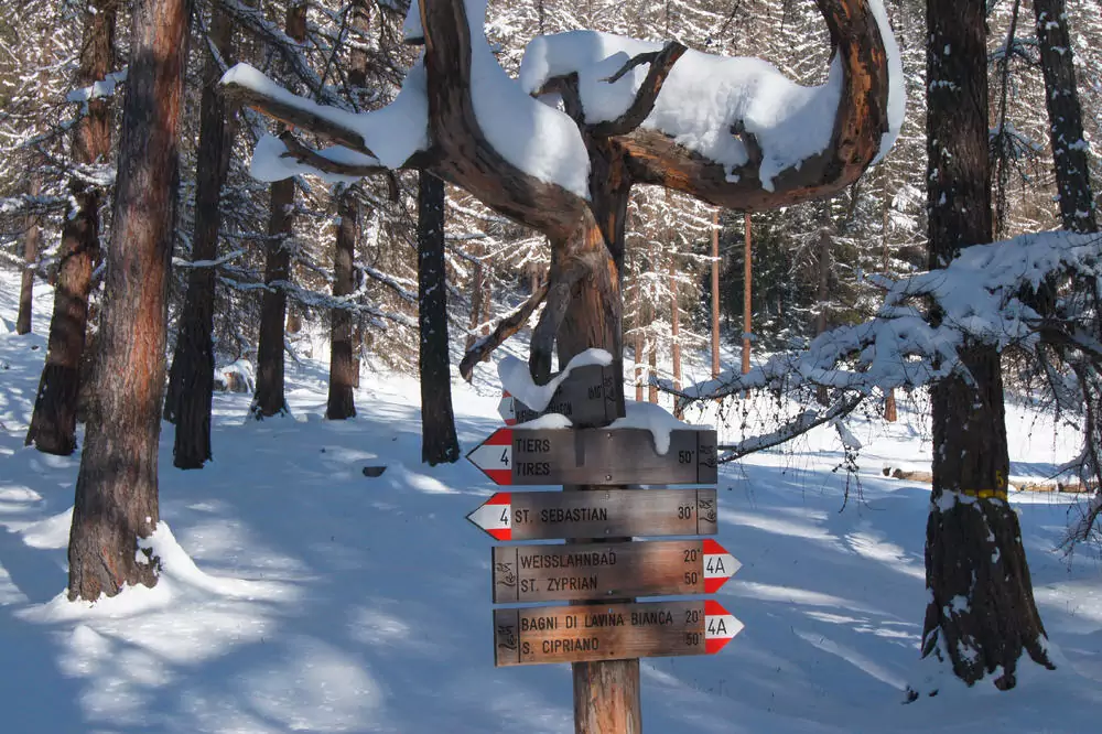 Unsere erste Wanderung startet direkt vom Hotel aus. Wir wandern durch schneebedeckte Wälder bis zum Kirchlein St. Sebastian und weiter zum Wuhnleger, einem künstlich angelegten Teich, der uns einen atemberaubenden Blick auf den Rosengarten und Latemar bietet. Über Weißlahnbad geht es gemächlich wieder zurück nach Tiers (GZ: 3 1/2 Std., +/- 400 m).