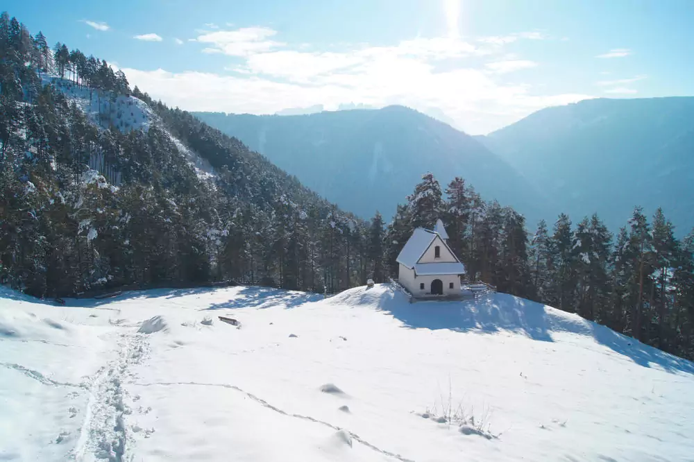 Von St. Zyprian steigen wir gemächlich hinauf ins Tschamintal. Unser Blick ist auf den Rosengarten gerichtet, aber auch die Gipfel des Tschamintals selbst faszinieren. Das Tal wirkt noch sehr unberührt und verwunschen. Durch weiße Wälder und über schneebedeckte Almen wandern wir am Tschaminbach mit seiner wilden Schönheit entlang (GZ: 4 Std., + 480 m, - 550 m).