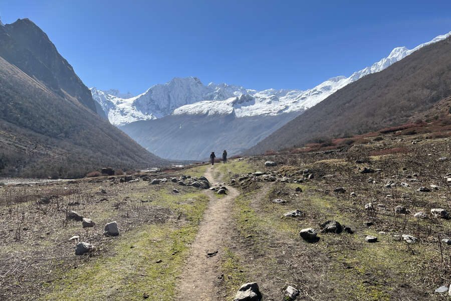 Hinter Samdo gabelt sich der Weg. In nordöstlicher Richtung geht es über einen für uns verbotenen 5.000er-Pass nach Tibet. Wir folgen dem Buri Gandaki bis zum einst blühenden Larkya Bazar (4.090 m) und steigen weiter auf bis zu unserer Unterkunft kurz vor Dharamsala auf 4.470 m Höhe. Wir ruhen uns aus und sammeln Kräfte für die morgige Schlüsselstelle der Tour. Die Nacht verbringen wir in einer Lodge, die über Mehrbettzimmer verfügt. (F, A)