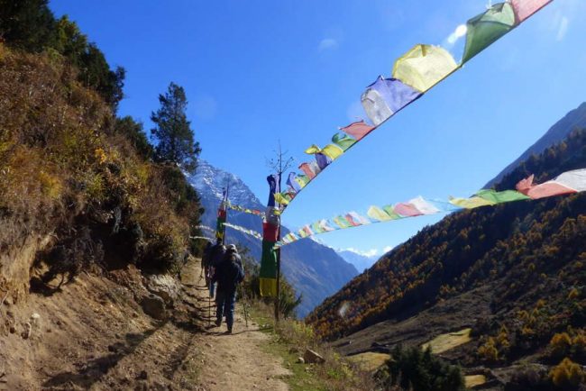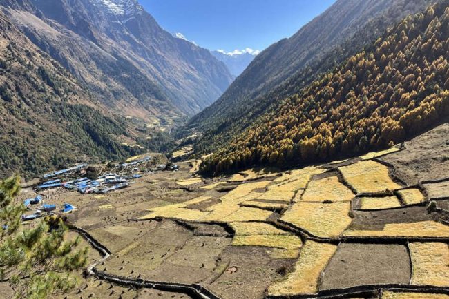 Wir wandern weiter bis zum Bothia-Dorf Ghap (2.160 m). Wir wechseln zur Südseite des Buri Gandaki und laufen während dieser Tagesetappe etwa parallel zu der nur 5 km entfernten tibetischen Grenze. Stets auf der linken Talseite bleibend, gewinnen wir über einzelne Dörfer und Gehöfte wie Syugjang und Bangsam stets an Höhe. Tschörten und Manimauern säumen den Weg. Vorbei an Feldern führt unsere Route bis zum Dorf Namrung (2.650 m). (F, A)