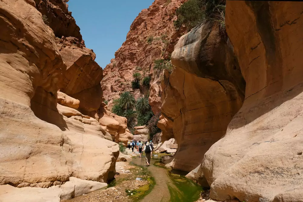 Let the fun begin! Im Mujib-Reservat, dem tiefstgelegenen Biosphärenreservat der Erde, entdecken wir den „Grand Canyon Jordaniens“. Wir waten durch den Fluss Wadi Mujib, der sich einige Kilometer durch eine tiefe Sandsteinschlucht windet. Kleine Wasserfälle überqueren wir über Felsen und Leitern. Je nach Saison können wir in den natürlichen Pools des Canyons ein erfrischendes Bad nehmen und uns auf dem Rückweg einfach treiben lassen. GZ ca. 3 Stunden. Inzwischen hat die Mittagssonne die Felswände in ein herrliches Gold gefärbt. Weil Wandern hungrig macht, machen wir uns anschließend auf zur kleinen Farm "Safi Kitchen" im fruchtbaren südlichen Jordantal. Aus dem hier angebauten frischen Gemüse bereiten wir gemeinsam ein schmackhaftes, landestypisches Mittagessen zu. Zurück am Toten Meer können wir den Tag schwebend auf der Wasseroberfläche ausklingen lassen. 100 km. (F, M, A)