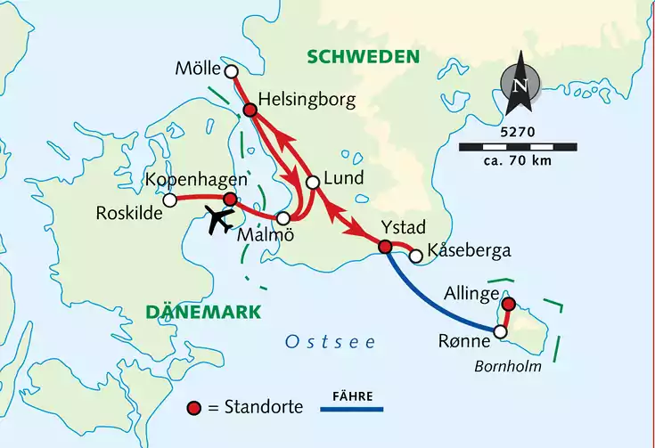 - Transfers in Dänemark und Schweden lt. Reiseverlauf, teilweise mit öffentlichen Verkehrsmitteln