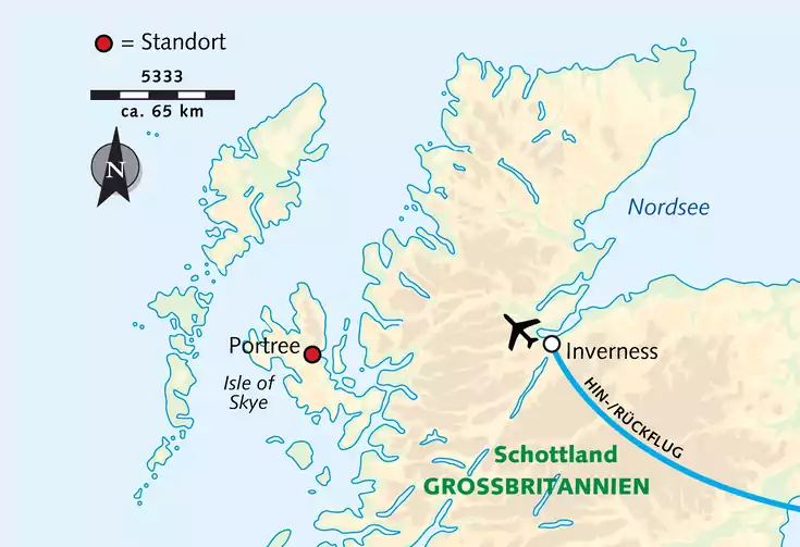 Flug nach Inverness. Transfer zu unserem Hotel in Portree auf der Isle of Skye (ca. 3 1/2 Std.).