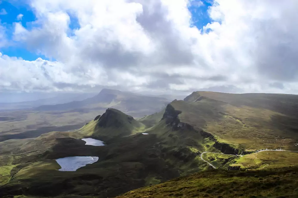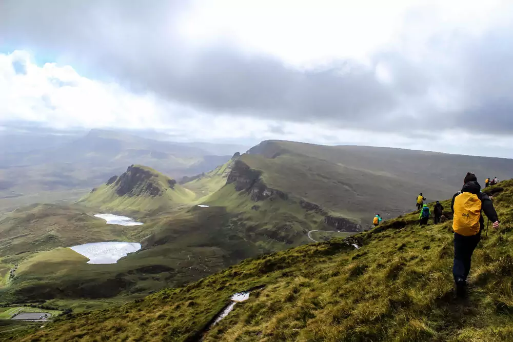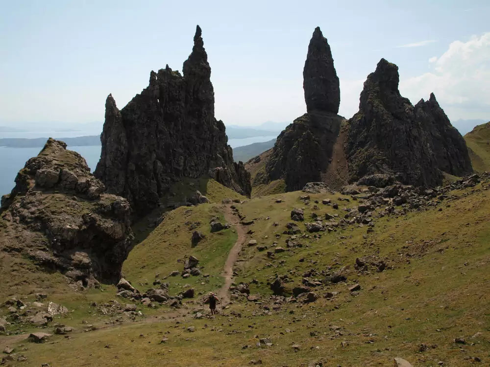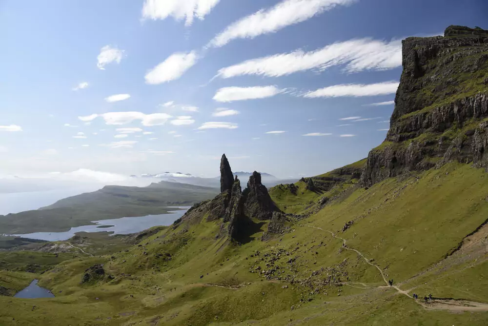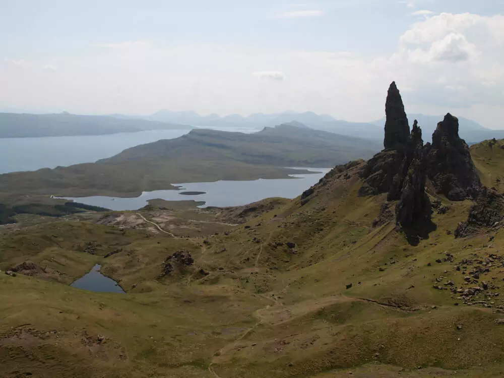 Heute jagt ein Highlight das nächste. Zunächst fahren wir zum Old Man of Storr, einer spektakulären Felsformation. Wir wandern über steiniges, steiles Gelände mit Ausblicken auf die surreal schöne Landschaft, die wie ein Grand Canyon am Atlantik wirkt, bis zu einem Aussichtspunkt (GZ: 2 Std., + 350 m, - 320 m). Anschließend fahren wir zum Gebiet The Quiraing. An einem kleinen See betreten wir die Bergwelt der Trotternish Ridge. Nach einem Anstieg auf schmalen, steinigen Torfwegen erwartet uns eine sensationelle Landschaft. Die Felsformation The Quiraing ist die Krone eines urzeitlichen Gebirges und bietet einen kontrastreichen Anblick mit ihren bizarren dunklen Formen, dem endlosen Grün der Berge und dem leuchtenden Blau des Atlantiks vor der Silhouette der Highlands auf dem Festland (GZ: 2 1/2 Std., + 230 m, - 80 m).