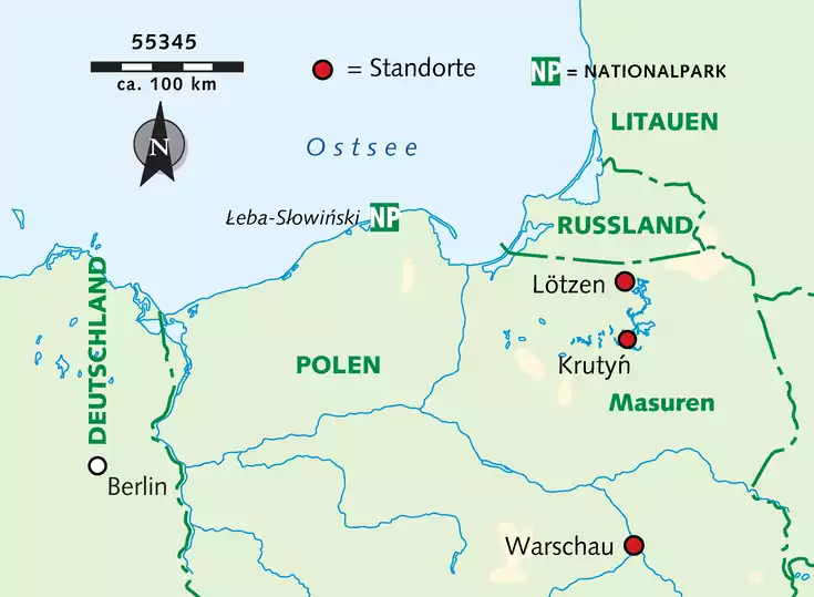 Warschau/Warszawa: In der ersten und letzten Nacht wohnen wir im zentral gelegenen Drei-Sterne-Hotel Holiday Inn Warsaw Express - The HUB by IHG. Das moderne Hotel verfügt über Zimmer mit TV, Föhn, Wasserkocher und kostenlosem WLAN. Lötzen/Giżycko: Für drei Übernachtungen erwartet uns das familiengeführte, ruhig gelegene Drei-Sterne-Hotel Mazury. Es liegt nur 200 m vom Kisajno-See entfernt. Alle Zimmer bieten uns Flachbild-TV, Föhn, Wasserkocher und teilweise Balkon. Krutyn/Kruttinnen: Weitere drei Nächte verbringen wir im familiengeführten Drei-Sterne-Hotel Mazur Syrenka, direkt am Ufer des Krutinnen-Flusses. Die 159 Zimmer verfügen über TV, Telefon, teilweise Balkon/Terrasse und WLAN in den öfentlichen Bereichen (Ü = Übernachtung).