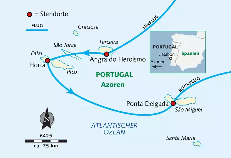 Üppig grüne Vegetation, grandiose Lavaformationen in Braun, Grau und Schwarz, umgeben vom tiefblauen Meer. Farbenfroh und abwechslungsreich präsentieren sich die drei Inseln mitten im Atlantik. Terceira mit der UNESCO-geschützten Altstadt Angra do Heroismo und rätselhaften Karrenspuren in der Inselmitte, Faial – die Insel der Weltumsegler mit der neuen Welt in Capelinhos und der Caldeira, die wir umrunden. Und natürlich die Hauptinsel São Miguel mit ihren Thermalquellen in Furnas und den unvergleichlichen Vulkanseen bei Sete Cidades.