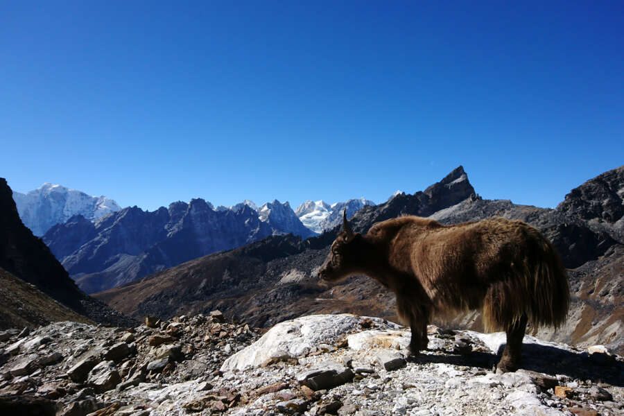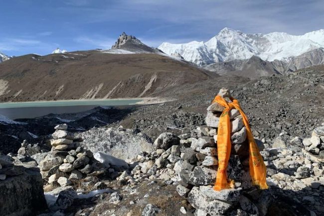 Die erste Passüberschreitung unserer Tour steht an. Der letzte, teils recht steile Abschnitt vor Erreichen des Passes besteht aus Blockwerk. Hier angelegte Steintreppen erleichtern aber den Aufstieg und machen die Route leicht begehbar. Am Pass wehen die Gebetsfahnen und wir werden mit einem traumhaften Ausblick belohnt. Vor uns die Achttausender Mount Everest, Lhotse und Makalu. Unter den Bergriesen schiebt sich der mächtige Gletscherstrom des Ngozumpa-Gletschers ins Tal und der türkisfarbene Gokyo-See sorgt für einen besonderen Farbtupfer im Gebirgspanorama. Im Westen blicken wir zurück ins Bhote Koshi-Tal und über die Berge des Rolwaling Himal. Nachdem wir uns satt gesehen haben, geht es bergab und wir folgen dem Pfad, der sich durch den Fels schlängelt. Durch einen relativ flachen Bereich, der einem großen Krater gleicht, folgen wir den in regelmäßigen Abständen platzierten Steinmännchen, bis auf die Alm Gokyo. (F, A)