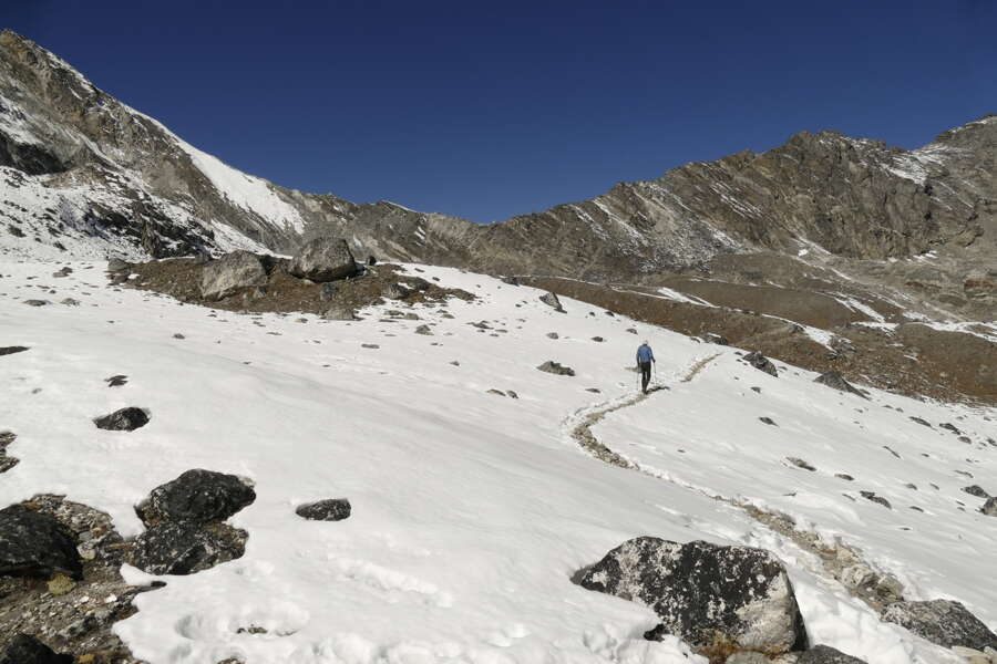 Im Hochtal von Nyimagawa folgen wir dem Pfad bis zum sogenannten Cho La-Hochlager (5.200 m) und bewältigen schließlich den 5.420 m hohen Pass Cho La. Der Aufstieg kann bei Regen, Schnee oder Vereisung rutschig sein, der Abstieg führt uns ein Stück über den Gletscher. Nun geht es zur Hochalm von Dzonghla (4.850 m) hinab. Im Süden erheben sich die um 6.500 m hohen, gewaltigen Massive des Taboche, Cho La Tse und die unvergleichliche Ama Dablam. (F, A)