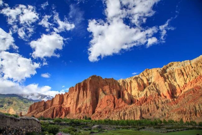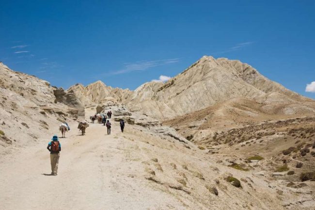Per kurzer Jeepfahrt überbrücken wir am Morgen entlang des Laufes des Kali Gandaki einen Pistenabschnitt nach Chhusang. Von dort tätigen wir unsere ersten Schritte hinein nach Upper Mustang und in das ehemals verbotene Königreich Lo, so der frühere Name der Region. Über eine Brücke queren wir den Fluss, der ab hier den Namen Mustang Khola trägt, und überwinden einen Geröllhang hinauf zum Ort Tsele (3.050 m). Nach einem stärkenden Mittagessen führt unser Aufstieg dann weiter durch eine Schlucht und über einen schönen Felsenpfad sowie über die beiden Pässe Taklam La (3.624 m) und Dajori La (3.736 m). Unterwegs öffnen sich schöne Panoramablicke auf die karge Landschaft, in der hier und dort ein paar Bäume für Kontrast sorgen. Schließlich geht es ein Stück bergab in den begrünten Ort Samar (3.660 m), wo sich uns ein beeindruckender Blick zur Annapurna- und Nilgiri-Gruppe bietet. (F, A)