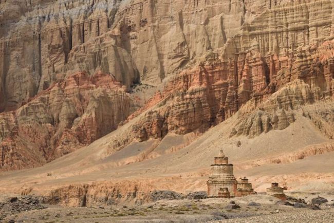 Auf einem aussichtsreichen Panoramaweg und über die beiden Pässe Nyi La (4.010 m) und Ghemi La (3.765 m) erreichen wir Ghemi (3.520 m), die drittgrößte Ortschaft in Mustang. Hier befand sich einst ein Lager der tibetischen Khampa (Freiheitskämpfer), die aus dem Exil heraus gegen chinesische Truppen agierten. Nach unserer Mittagspause queren wir den Ghemi Khola – ein Zufluss des Khali Gandaki – und nach einem letzten steilen Anstieg für heute erreichen wir das in einem Seitental gelegene Dorf Dhakmar (3.820 m). Die roten Sedimentwände rund um den Ort bieten einen spektakulären Anblick. Im Laufe der Zeit haben Wind und Wasser die Klippen geformt und einzigartige Muster und Formationen geschaffen – je nach Sonnenstand wechseln die Farben. (F, A)