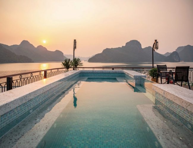 Die Halong Bucht (Halong = herabsteigender Drache) im Norden Vietnams – ist eine bizarre Welt von beinahe 2000 Kalkfelsen, zumeist unbewohnten Inseln und Felsen, die zum Teil mehrere hundert Meter hoch aus dem Wasser ragen. Flora und Fauna entwickeln sich wild und unberührt. Unter Wasser schafft das warme Klima ideale Verhältnisse für mehr als tausend Fischarten und 160 Korallenarten. Eine Landschaft für Legenden. An Bord der eleganten Indochine Grand trifft nostalgisches Design auf modernen Luxus für eine exklusive und unvergessliche Reise.