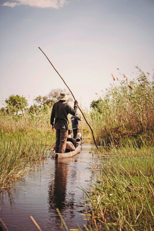 (Mittwoch) Tauchen Sie ein in die faszinierende Welt des Okavango Deltas und lassen Sie sich von der Ruhe und dem Zauber in den Bann ziehen! Ein echtes Abenteuer erwartet Sie: eine traditionelle Mokoro-Exkursion (Einbaum), bei der Sie lautlos durch die Kanäle fahren. Ihr ortskundiger Guide wird Ihnen das reiche Ökosystem des Deltas erklären, während Sie an wunderschönen Seerosen und Schilf vorbeifahren. Mit etwas Glück entdecken Sie sogar eine Sitatunga-Antilope! Auf einer der Inseln bei der anschließenden kleinen Wanderung wird es mittags ein Picknick geben. Vor dem Abendessen können Sie in der Lodge entspannen und die wunderschöne Umgebung auf sich wirken lassen. (Frühstück, Picknick, Abendessen)