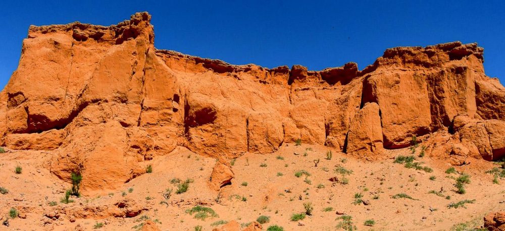 Etwa 45 Kilometer westlich von Dalandsadgad liegt Jolyn Am, ein malerisches enges Tal, auch Geierschlucht genannt. Die Schlucht liegt östlich des Gurwan-Saichan-Berges im Osten des Altai-Gebirges. Der Bach, der sich durch das Tal schlängelt, verschwindet am Ende unter einem nach dem Winter meterdicken Schneefeld, das auch im Sommer nicht komplett abtaut. Du wanderst etwa eineinhalb Stunden durch das Tal und kannst dabei mit etwas Glück Geier, Steppenbussarde und verschiedene Falkenarten am blauen Himmel kreisen sehen.