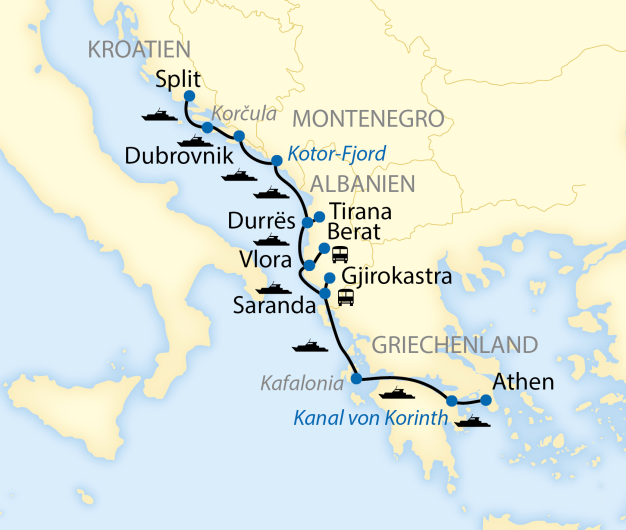 Haben Sie Lust auf Exotik vor der Haustür? Zwischen der Adria und dem Golf von Korinth verbirgt sich Europas bestgehütetes Geheimnis: Albanien. Das Land der Skipetaren war unter der Herrschaft des paranoiden Diktators Enver Hoxha jahrzehntelang völlig isoliert. An seinen unberührten Küsten gehen Sie mit dem kleinen Segel-Kreuzfahrtschiff MS Panorama I auf Zeitreise in die griechische Antike, tauchen ein ins Osmanische Reich und in die Welt von Karl May. Auch sonst bietet die Adria-Küste einen Abwechslungsreichtum sondergleichen! Es erwarten Sie die wilden Schluchten des Balkans, Europas südlichster Fjord, verträumte venezianische Städte und Inseln mit Postkarten-Flair.