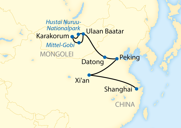 Freuen Sie sich auf die endlosen Weiten der mongolischen Steppe und Nächte unter sternenklarem Himmel – unternehmen Sie mit uns eine Zugreise in die Erdvergangenheit! Rollen Sie von der Einsamkeit der Mongolei auf Schienen durch die Wüste Gobi, bevor Sie als Kontrastprogramm in das geschäftige Treiben der chinesischen Hauptstadt Peking eintauchen. Als weiteres Highlight besuchen Sie die berühmte Terrakotta-Armee des ersten Kaisers von China, bevor Sie die futuristische Metropole Shanghai bestaunen.