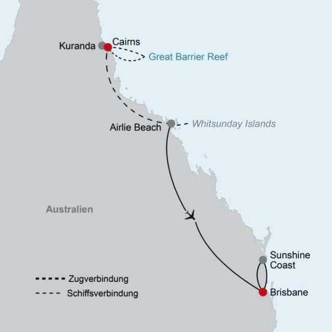 Entdecken Sie das berühmte Great Barrier Reef, genießen Sie eine nostalgische Eisenbahnfahrt durch den Regenwald und den Spirit of Queensland. Erleben Sie einen Segeltörn zu den Whitsundays mit ihrem traumhaften Whitehaven Beach. Diese Reise verspricht unvergessliche Momente und Naturschönheiten!