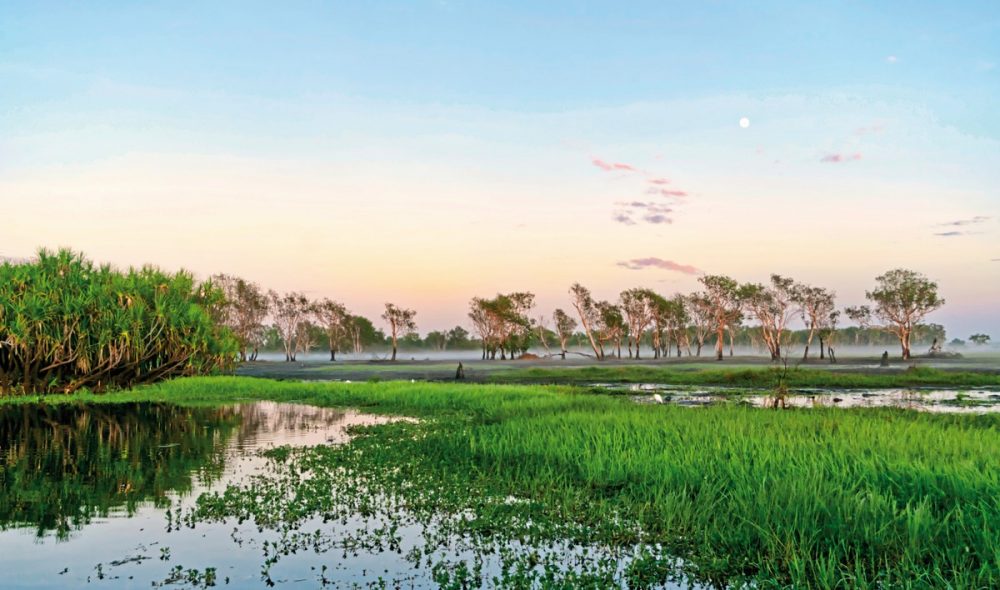 (Samstag) Der Tag beginnt einfach super gut: mit einer lauschigen Bootsfahrt auf der Yellow Waters Lagoon. Gleich nach dem Frühstück werden Sie begrüßt von farbenfrohen Papageien, Pfeifmilanen und anderen exotischen Vögeln – womöglich auch von dem ein oder anderen Salzwas-serkrokodil. Danach fahren Sie zu den kulturellen Schätzen des weltberühmten Nationalparks: Am Nourlangie Rock haben Aboriginals bereits vor 20 000 Jahren eindrucksvolle Spuren hinterlassen. Während der Rückfahrt nach Darwin lässt ein Stopp am „Window of the Wetlands“ noch einmal weit über die von Wasser-vögeln beherrschten Feuchtbiotope blicken. Eine Nacht im DoubleTree By Hilton Esplanade Darwin (gehoben Mittelklasse). Ca. 320 km (Frühstück)