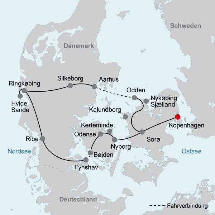 Individuelle Abreise z. B. über Kopenhagen. Ca. 90 km/ca. 1 Std. (Frühstück)