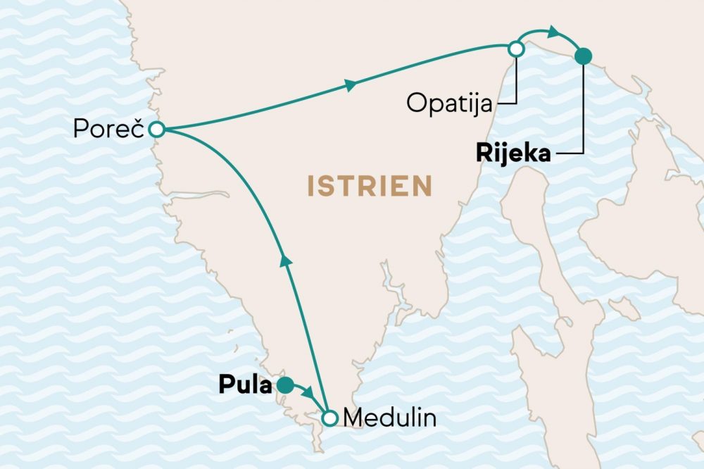 7 Übernachtungen/Frühstück: 2x Park Plaza Belvedere, Medulin; 3x Hotel Molindrio Plava Laguna, Poreč; 2x Bristol Hotel Opatija, Opatija
