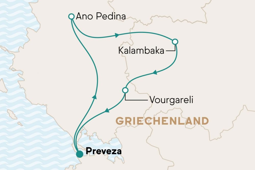 Sie starten im Bergdorf Vourgareli im Herzen der Tzoumerka-Berge, umgeben von Kastanienwäldern und klarer Luft. Die Strecke führt über kurvige Straßen durch beeindruckende Berglandschaften. Ein Zwischenstopp in Arta lohnt sich, um die berühmte Arachthos-Brücke zu besichtigen, ein Symbol regionaler Geschichte und Architektur. Unterwegs bieten sich mehrere kleine Tavernen an, in denen lokale Spezialitäten wie Tzoumerka-Schafskäse oder Kataifi mit Honig probiert werden können. Die Region verbindet natürliche Schönheit mit traditionellen Geschmackswelten. Weiter geht es durch sanfter werdendes Terrain Richtung Ionisches Meer. Vorbei an kleinen Dörfern und Olivenhainen öffnet sich der Blick schließlich auf Kanali Beach, einen ruhigen Sandstrand bei Preveza. Am späten Nachmittag erreichen Sie wieder Preveza.