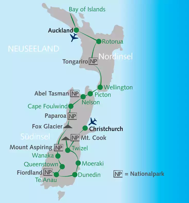 Während bei uns der Sommer auf seinem Höhepunkt ist, beginnt für viele Kiwis die schönste Zeit des Jahres: der Winter. Insbesondere die Südinsel hält bei guten Wetterbedingungen einige Überraschungen für uns bereit. Ob schneebedeckte Berge im Mount Cook National-Park, Winterzauber im Fjordland oder reges Treiben im Skigebiet bei Wanaka - Neuseeland zeigt sich im Winter von einer ganz besonderen Seite. Die für mildere Klima bekannte Nordinsel ist ebenso beeindruckend. Heiße Quellen, Geysire und Vulkanlandschaften warten nur darauf erkundet zu werden. Ein Besuch bei den Maori bringt uns die Kultur der Ureinwohner ganz nah. Und da Neuseeland im Winter vergleichsweise wenig bereist wird, können wir all dies ungestört erleben. Also, sei dabei und erlebe das Ende der Welt auf eine einzigartige Art und Weise!