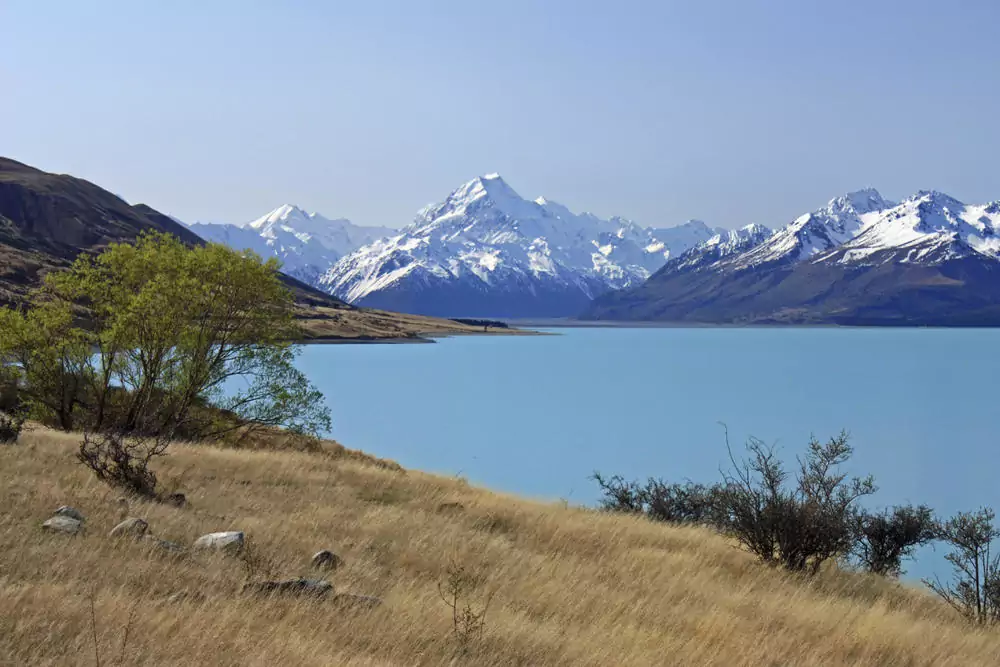 Das türkisfarbene Wasser des Lake Tekapo bildet einen malerischen Kontrast zu den dahinter liegenden Schneefeldern der neuseeländischen Südalpen. Von hier ist es nicht mehr weit zum kleinen Farmort Twizel. 2 Übernachtungen in Twizel. 290 km.